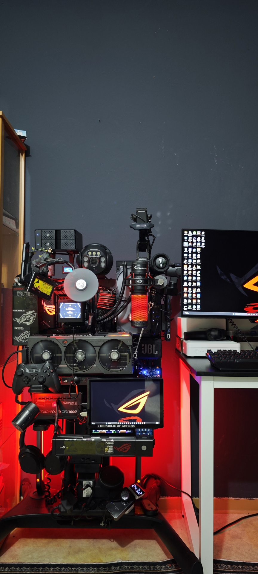 As seen in the heart of the build, we utilize a HyperX QuadCast (custom-branded with ROG aesthetics) to ensure voice clarity matches the high-end visuals.