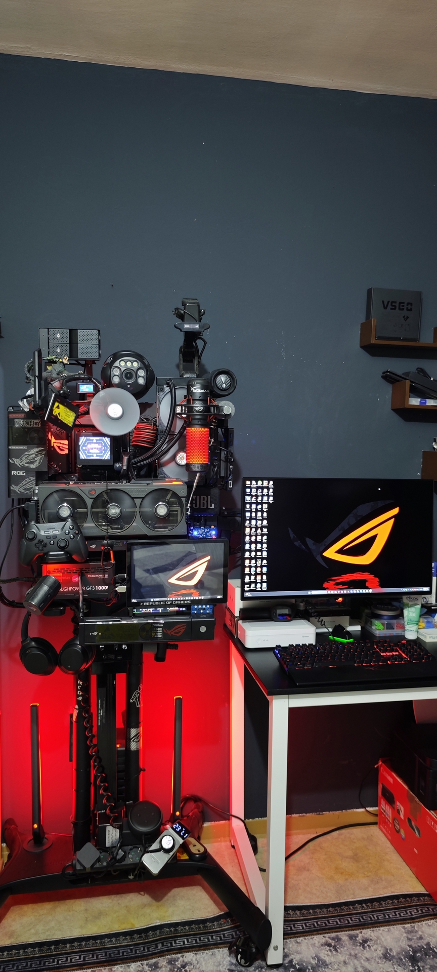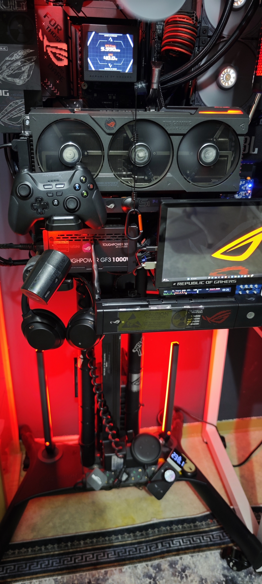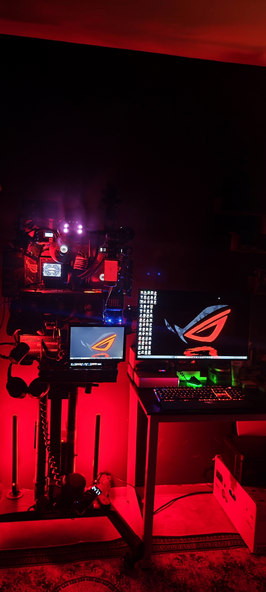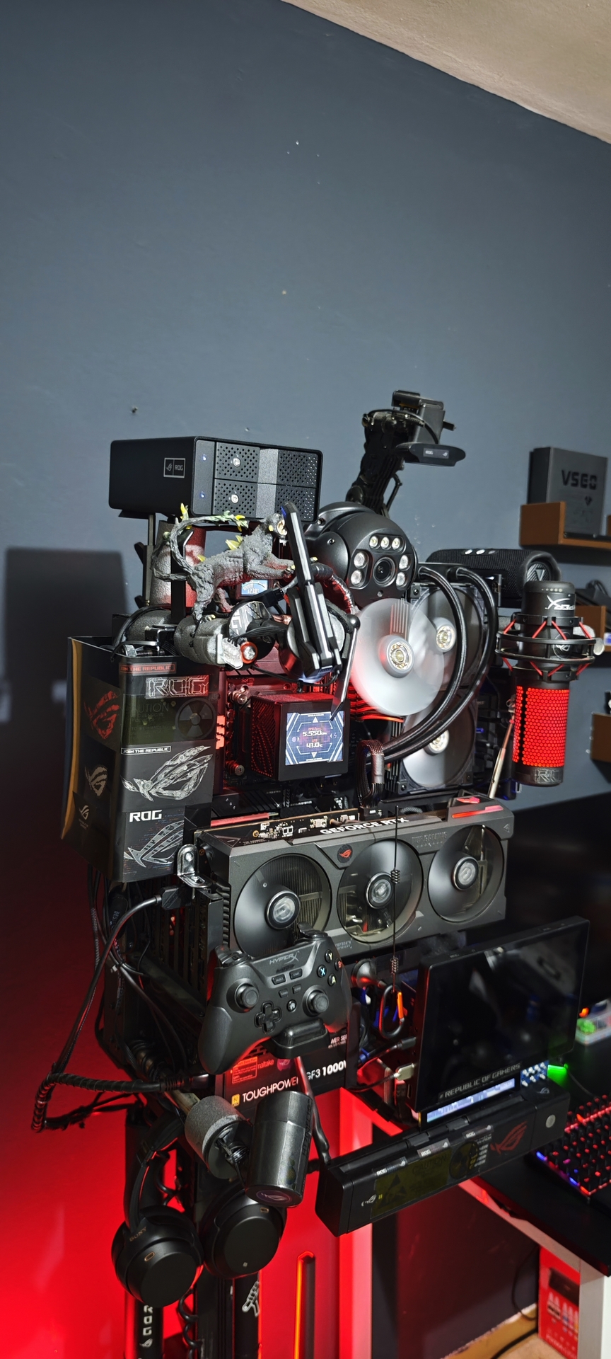 As seen in the heart of the build, we utilize a HyperX QuadCast (custom-branded with ROG aesthetics) to ensure voice clarity matches the high-end visuals.