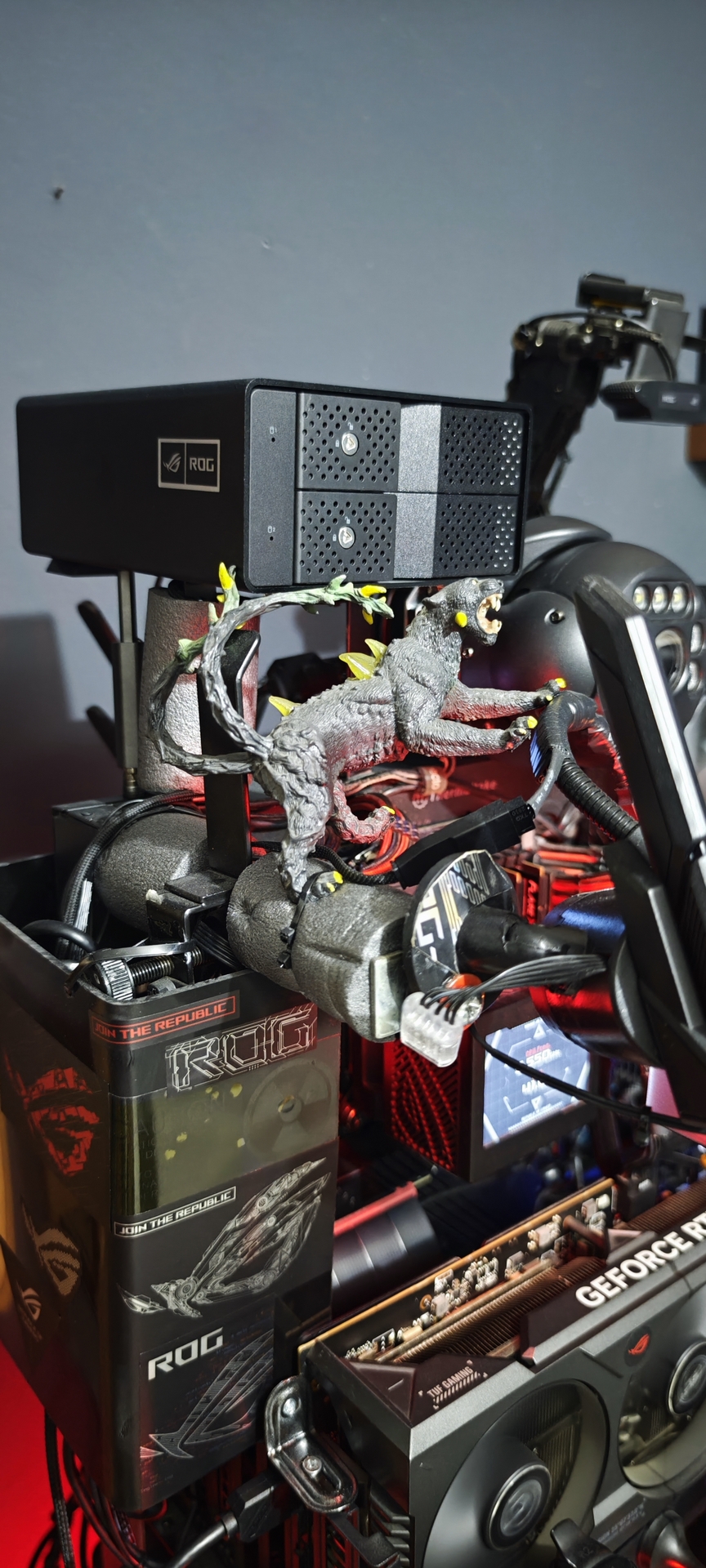 > **Technical Note:** The visual synergy between the **Cerberus** figure atop the storage hub and the red "lava" cabling creates a consistent "Underworld Guardian" aesthetic that perfectly matches the ROG brand.